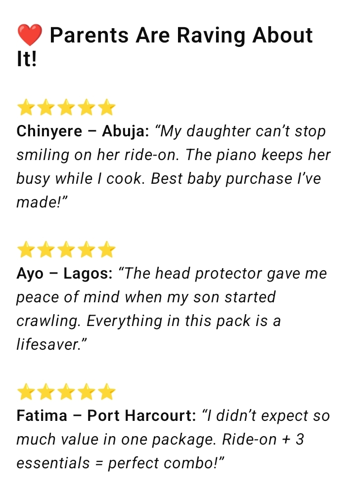 Unlike ordinary ride-on toys, this comes bundled with Premium Baby Care Add-Ons,carefully chosen to make parenting easier: